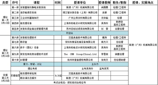 為了更好的提升油漆涂裝線技術人員和管理人員的專業技術水平,系統地學習了解油漆涂裝線的基本理論知識和專業新技術,聯德攜手中國表面工程協會涂裝分會、上海涂裝行業協會及專業機構于2017年3月13日-15日舉辦一次專業性強、知識覆蓋面廣泛的涂裝工程技術培訓班,為廣大涂裝屆人士提供一場知識交流、技術提升的盛會。?主辦單位:中國表面工程協會涂裝分會 上海涂裝行業協會 聯德(廣州)機械有限公司協辦單位: 東莞豐裕電機有限公司 廣東智展展覽有限公司培訓日期:2017年3月13日~3月15日【3天】08:30-17:00培訓地點:聯德(廣州)機械有限公司(廣州市大觀路科學城南云一路17號)報名聯系人:中國表面工程協會涂裝分會/上海涂裝行業協會秘書處 :021-63529000 吳芳 :13761054243 吳偉玲 :13918293257課程表: