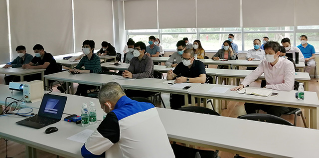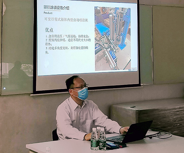 聯德(廣州)技術部方案組肖國勇經理為參會人員細致地講解蘭氏/聯德涂裝設備產品,尤其對2019年新研發的新產品,可變行程式箱體內壁自動噴涂機(已在申請發明專利)、弧形跟蹤往復式升降機、集裝箱端面仿形自動噴涂機等進行了針對性的技術問題詳細講解,并與銷售人員積極互動交流,耐心解答銷售人員在產品應用方面遇到的難題。