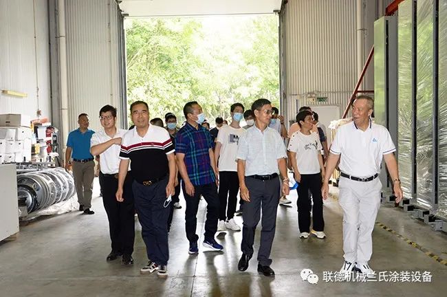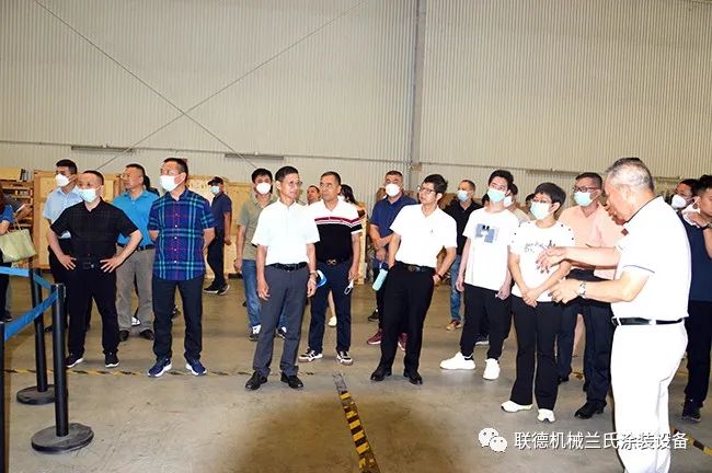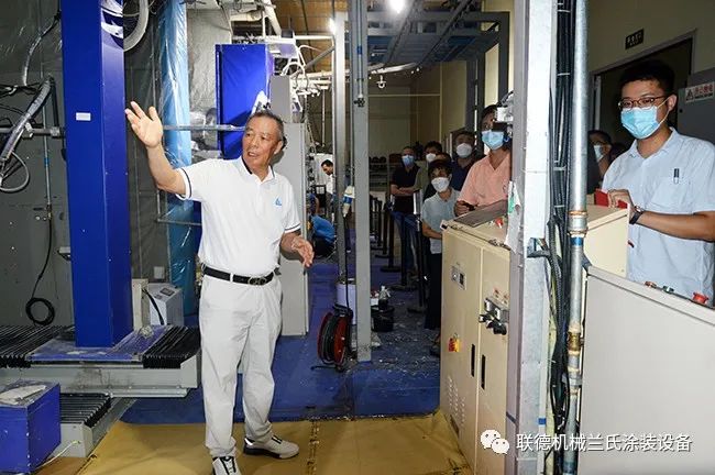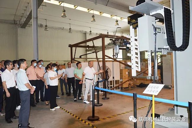 13:30分,參觀團隊伍一下車,便浩浩蕩蕩地走進聯德生產基地,了解噴涂機器人、最新專利產品橫式噴涂專機及噴涂往復機等。葉總向參觀團介紹,進入調試區的產品,都是客戶已經定制的產品。這些產品都是嚴格按照ISO9001質量管理體系認證標準生產調試。他們保證了噴涂設備的最佳運行狀態,確保了客戶定制產品的安全、高效、穩定、可控。
